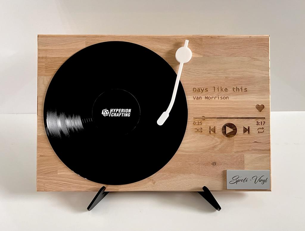 Hyperion Crafting, a young and innovative company based in the Netherlands, invented the Spoti-Vinyl and the Vinyl-Frame. A well-finished oak-wood panel, engraved with the latest laser techniques combined with a real vinyl plate. You can capture your favorite song on the Spoti-Vinyl or a whole vinyl album on the Vinyl-Frame. You could hang it on the wall or you could put it on an orderable black high gloss acrylic base.
