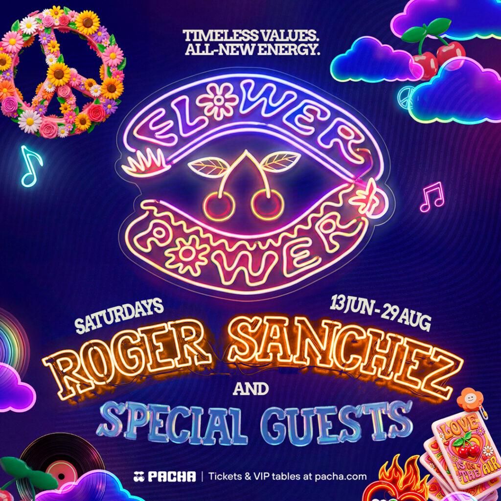 - Roger Sanchez at the decks with occasional special guests joining Sanchez throughout the residency, a recipe in the Flower Power tradition where iconic and guest DJs like Bora Uzer, Louis Vega, Purple Disco Machine or even Boy George enhance the night.
