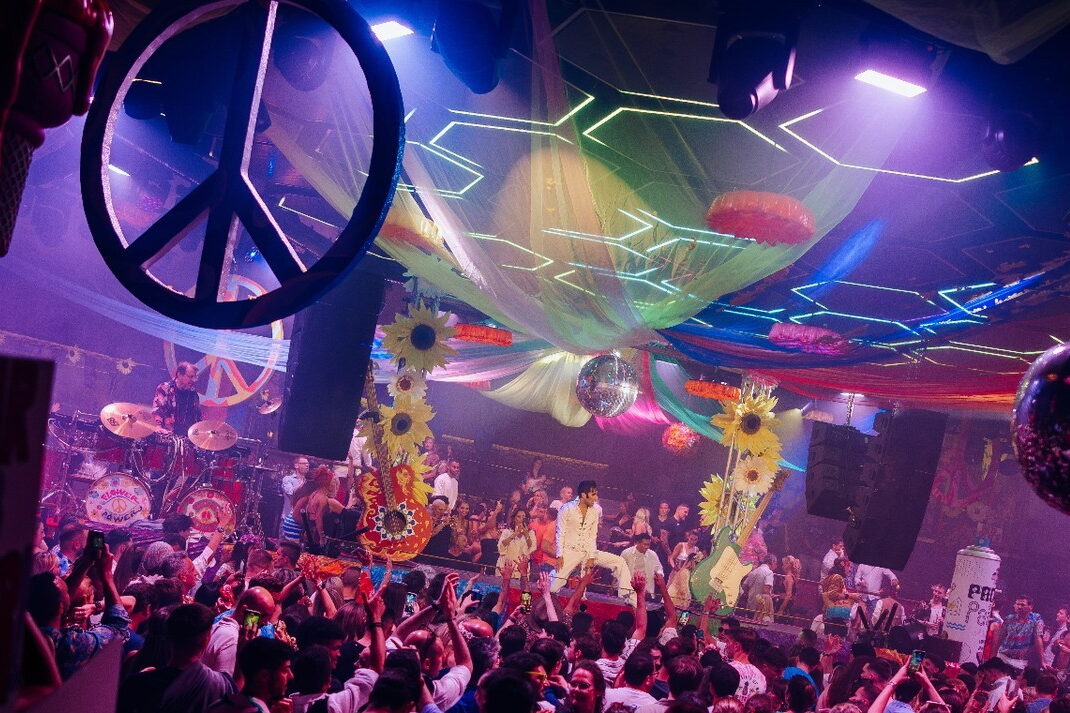 Its endurance is what makes it significant. In an environment where residencies often last only a season or two, Flower Power became one of Ibiza’s oldest and most recognizable theme nights, evolving alongside the island without abandoning its identity. The décor, the dress codes, the open-hearted atmosphere, the hippies vibe, the disco balls — all functioned as reminders that Ibiza’s nightlife wasn’t born purely from electronic music, but from a broader cultural movement rooted in freedom and shared experience.