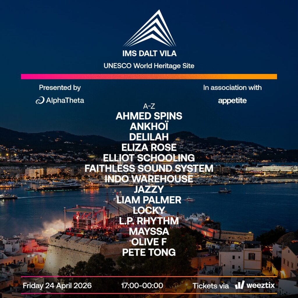 Set high above the island with panoramic views over Ibiza’s old town and the Mediterranean, IMS Dalt Vila is officially back. Presented by AlphaTheta in association with Appetite, the 2026 edition will take place on Friday, 24 April 2026, once again serving as the grand closing event of International Music Summit Ibiza.